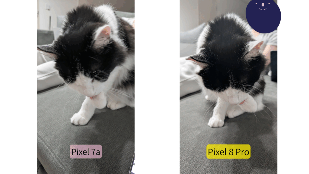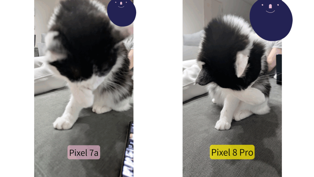個人的な感想ですが、Pixel 8 Proの方がブレが少なく、毛づくろい中の顔もはっきり撮れています。