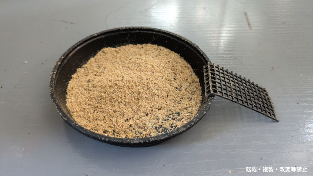 餌入れも浅めの皿(鉢皿など)を使い、足場に園芸ネットを敷いています。