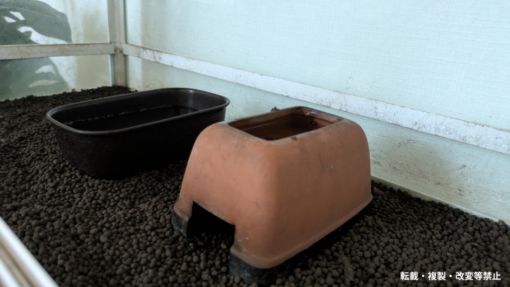 アカメカブトトカゲは熱帯雨林に住んでいるので、湿度高め&隠れ家多めの環境がベストです。