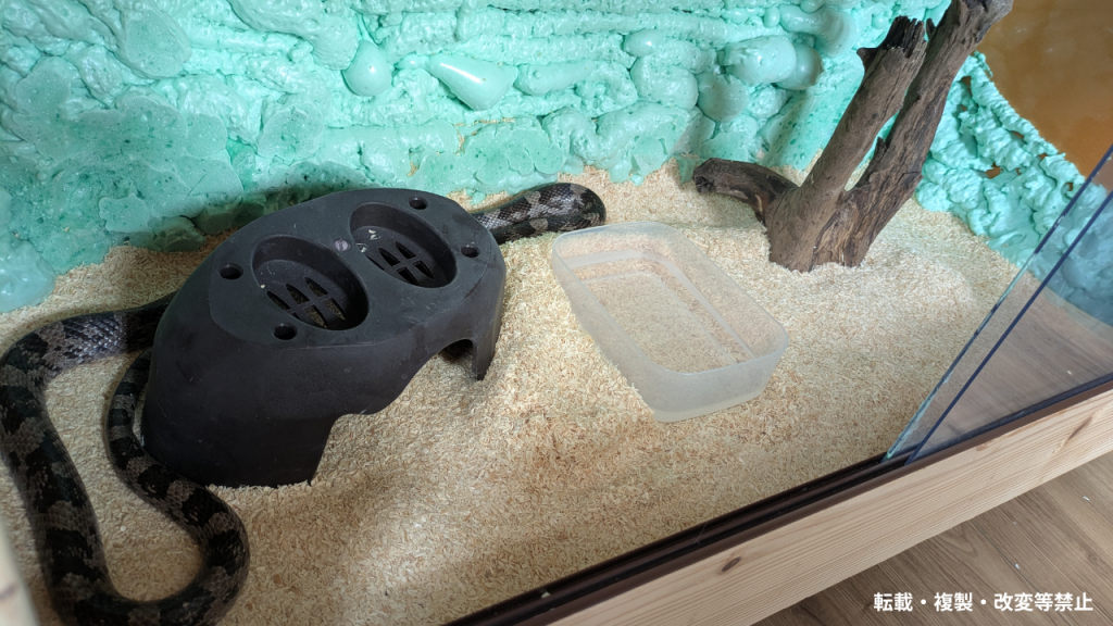 夜行性で半樹上性のヘビのため、高さと幅のあるケージ、そしてシェルターが必須です。
