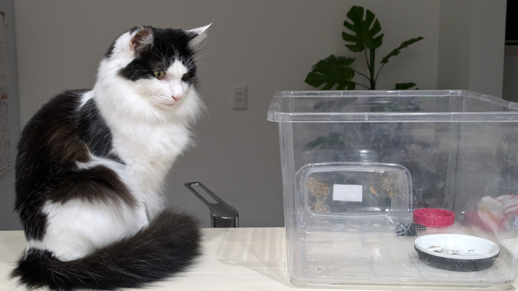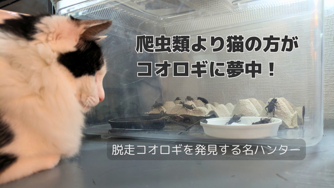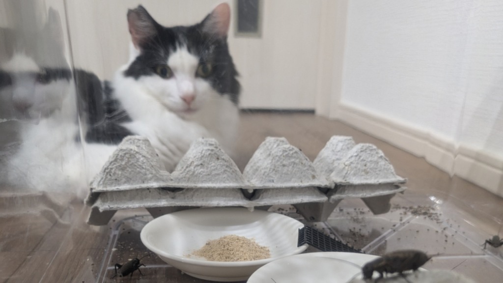 爬虫類のエサとして生きたコオロギを飼育しているのですが、実はそれに一番興味を示しているのは…なんと猫の方なんです!