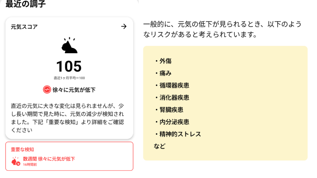 そのため、毛づくろい時間が短かったことで元気スコアの低下が検知されました。正しく検知されている証拠だなと感じます。