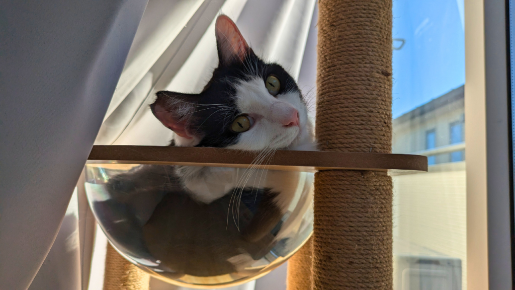うちの子は新しいものに警戒心が強く、使うまでに3か月かかることも。特に透明のボール型の部分にはなかなか入ってくれませんでしたが、今ではしっかり丸くなって寝ています。