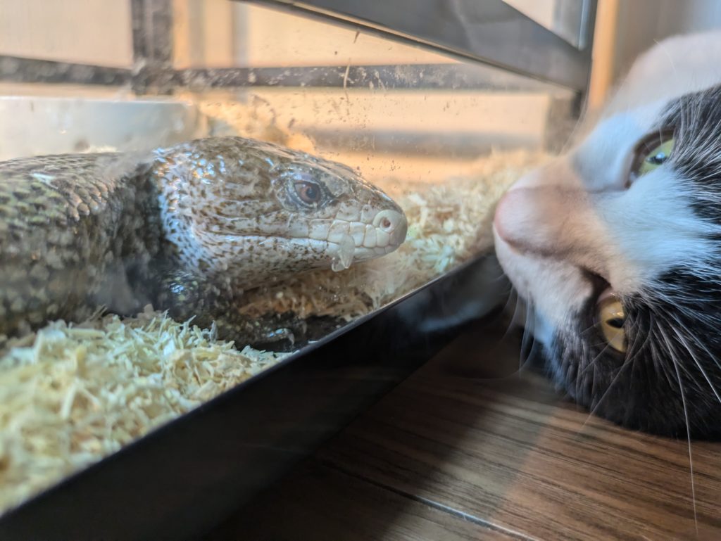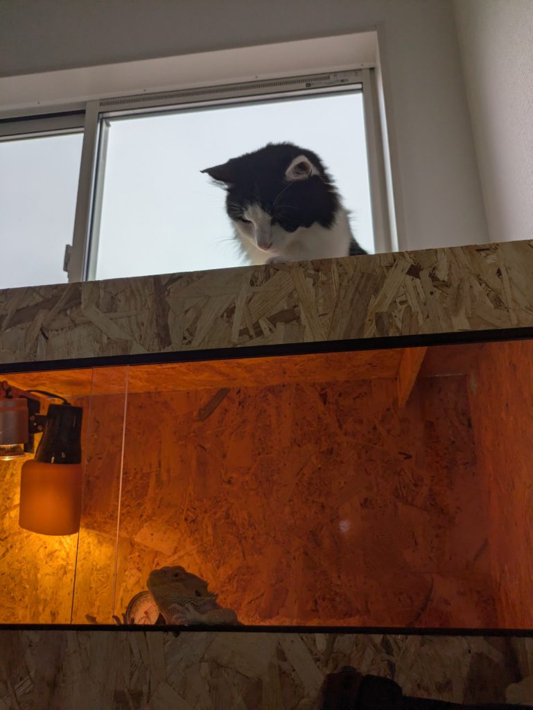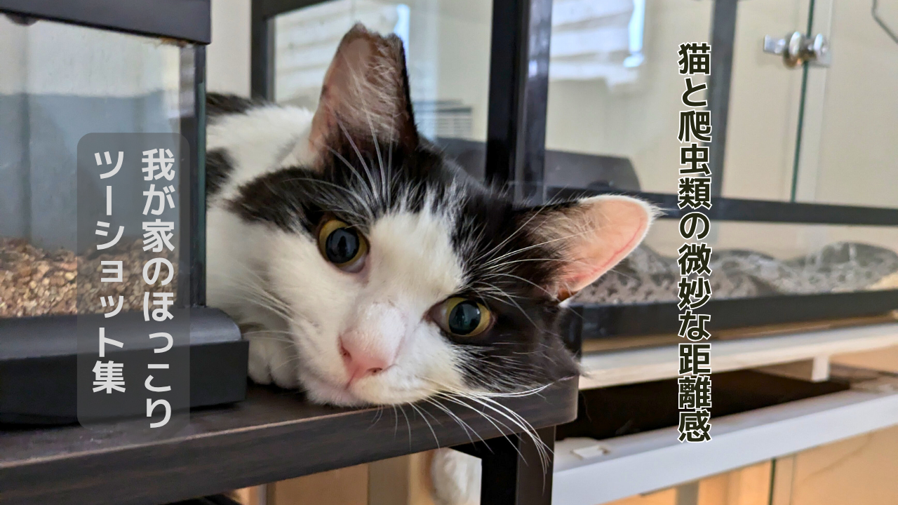 猫と爬虫類、それぞれにストレスをかけないよう注意しながらですが、こんな風にちょっとした交流が見られるのは飼い主としても癒される時間です。