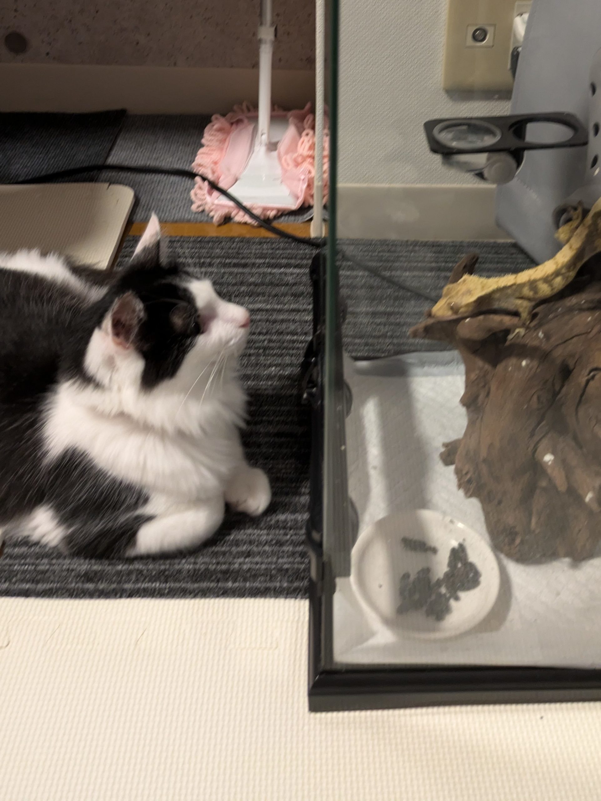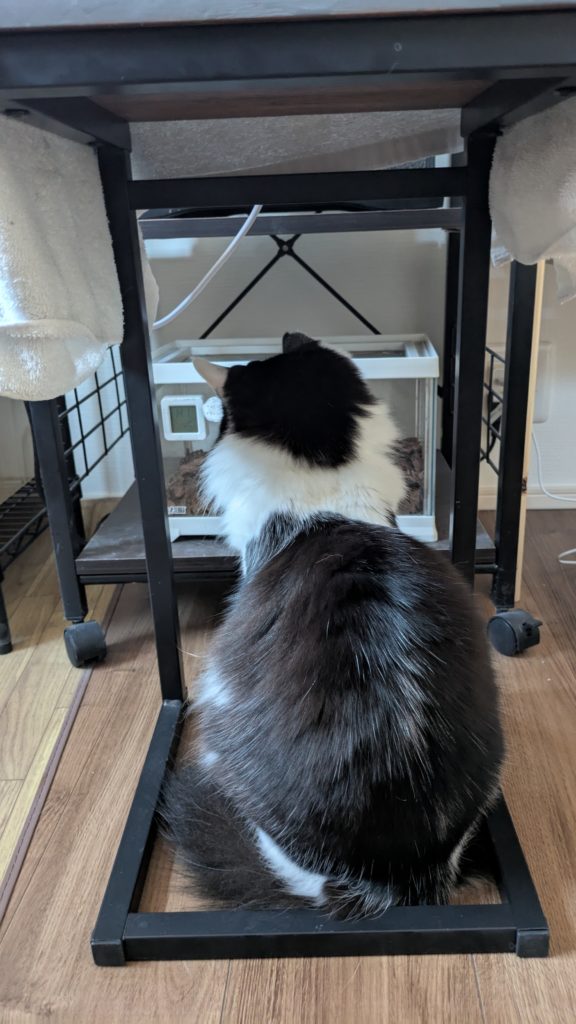 それでも、我が家の猫「じゅんちゃん」は、どうやら爬虫類の観察が大好き。目を離さないとき限定で、ケージ越しにじっと眺めている時間を許可しています。