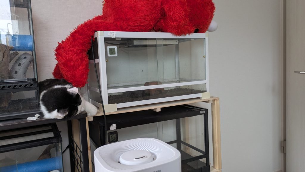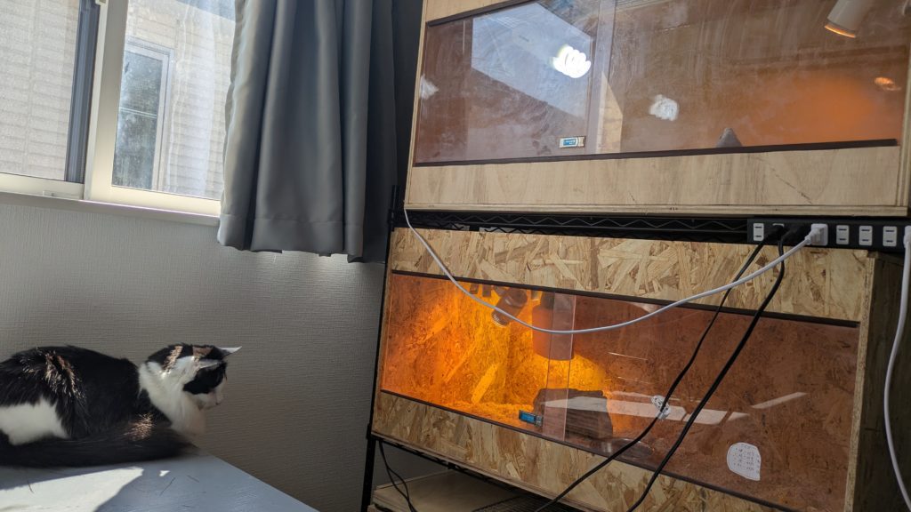 我が家では猫と爬虫類が安全に共存できるよう、基本的には距離をとって飼育しています。