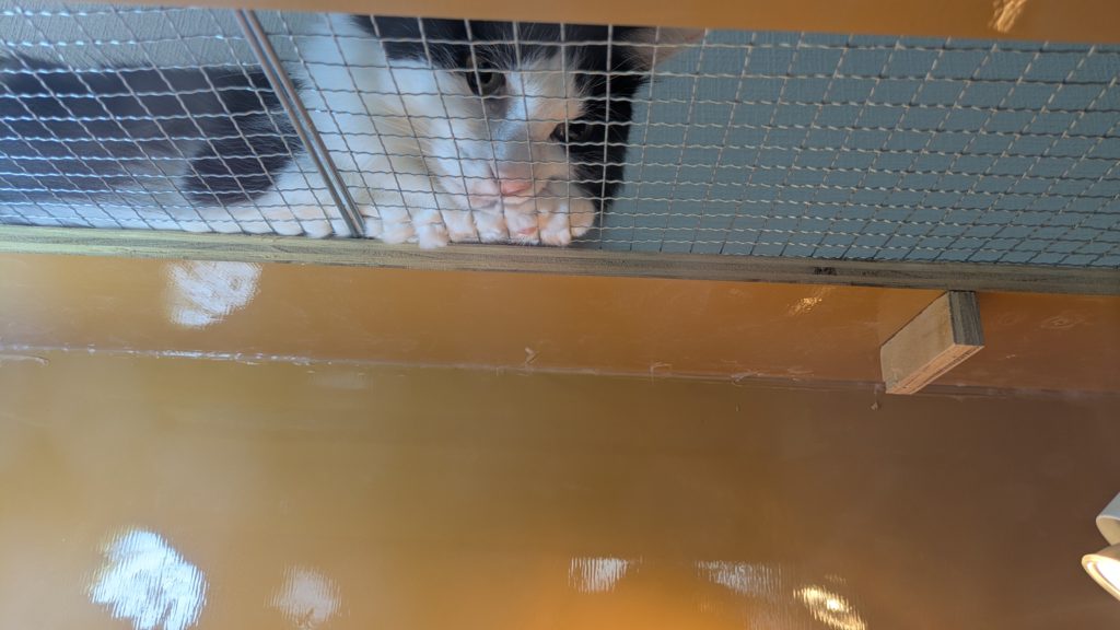 ケージの間にスッと入り込んで、静かに観察中。たまにケージの上に乗っちゃうこともあるけど、おとなしく見ていることがほとんどです。