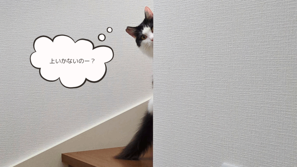 夫と私、どちらか一人が下にいたら、上に行くまで階段で待ってくれるじゅんちゃん。平等猫です。