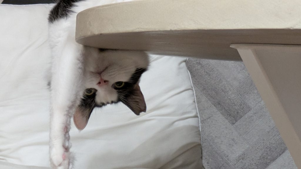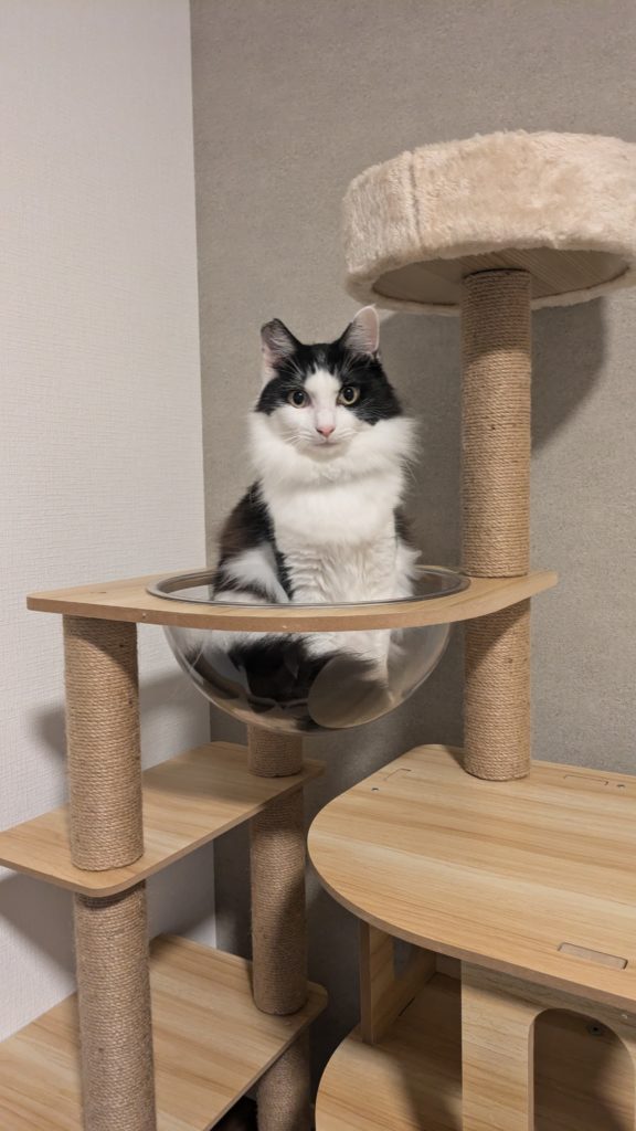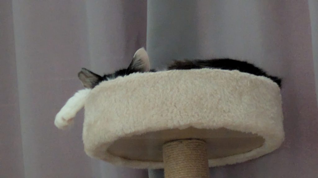 - キャットタワーから頭をたらしている姿がツボ
