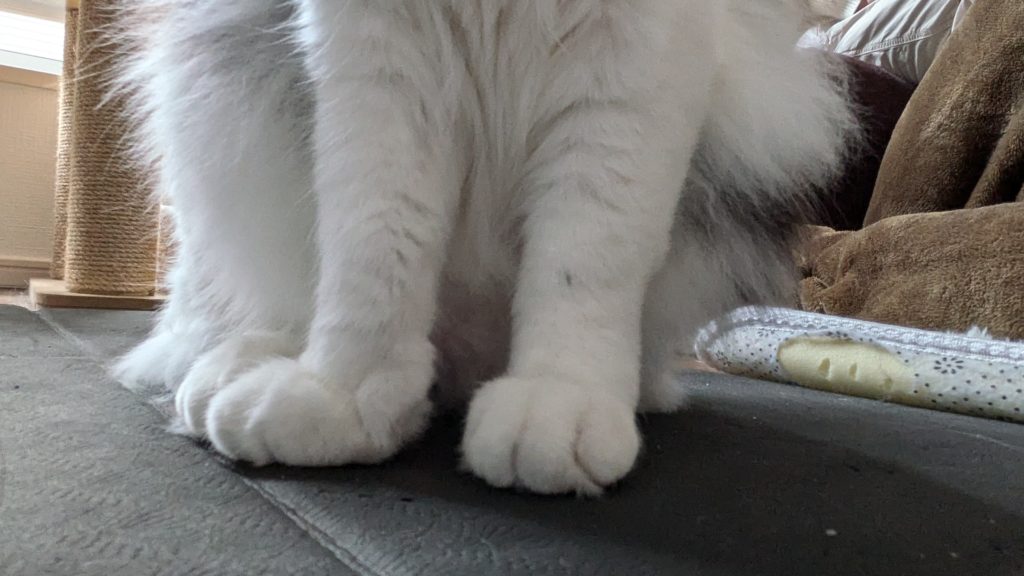 ぷにぷにしてそうな前足、揃えている時のきちんと感、肉球がチラ見えすると、心がとろけます…