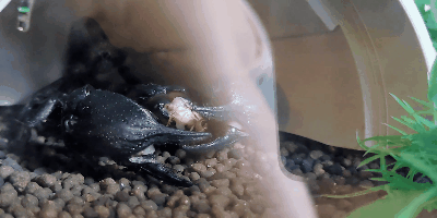 コオロギを発見すると、まず両手のハサミでしっかりと掴みます。